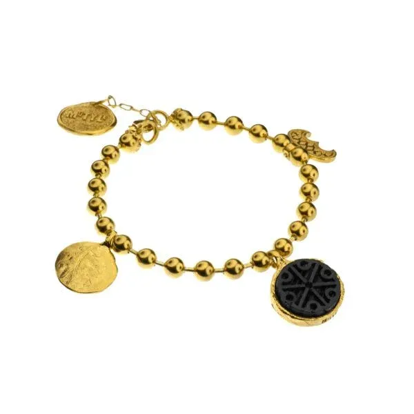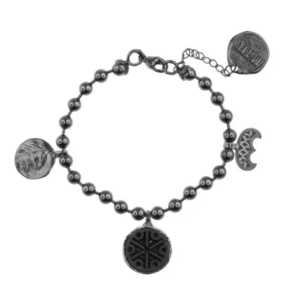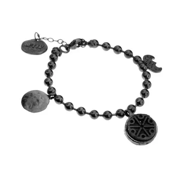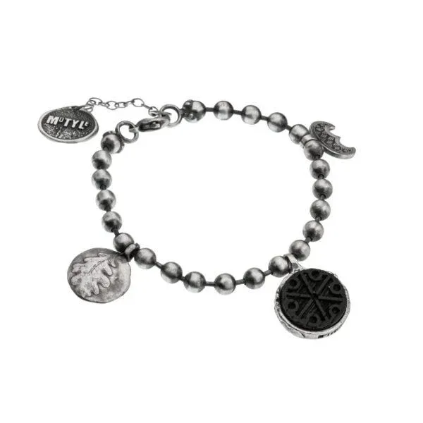 Artystyczna bransoletka została zaprojektowana i wykonana w naszej autorskiej pracowni biżuterii Motyle w Sopocie. Niezwykły design srebrnej bransoletki tworzy połączenie klasycznego kulkowego łańcuszka ozdobionego etnicznymi dodatkami w formie przywieszonych medalionów tj.: