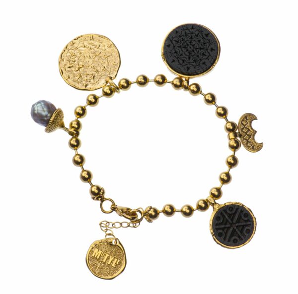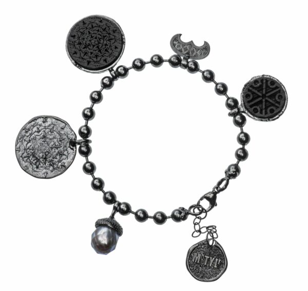 Artystyczna bransoletka została zaprojektowana i wykonana w naszej autorskiej pracowni biżuterii Motyle w Sopocie. Niezwykły design srebrnej bransoletki tworzy połączenie klasycznego kulkowego łańcuszka ozdobionego etnicznymi dodatkami w formie przywieszonych medalionów tj.: