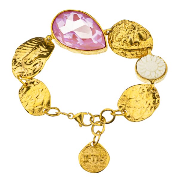 Bransoletka z tej kolekcji to wyjątkowa ozdoba, która łączy w sobie delikatność i wyrafinowanie. Różowy kryształ Swarovskiego, opalizujący na niebiesko, przyciąga spojrzenia swoim hipnotyzującym blaskiem, przywołując skojarzeniami poranną rosę. Symbolizuje on wewnętrzne piękno i duchowe oczyszczenie, przypominając, że prawdziwa siła tkwi w subtelności.