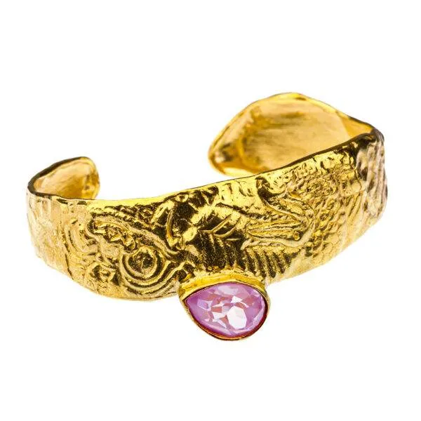 Bransoletka z tej kolekcji to wyjątkowa ozdoba, która łączy w sobie delikatność i wyrafinowanie. Różowy kryształ Swarovskiego, opalizujący na niebiesko, przyciąga spojrzenia swoim hipnotyzującym blaskiem, przywołując skojarzenia z rozświetloną poranną rosą. Symbolizuje on wewnętrzne piękno i duchowe oczyszczenie, przypominając, że prawdziwa siła tkwi w subtelności.