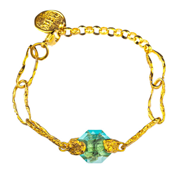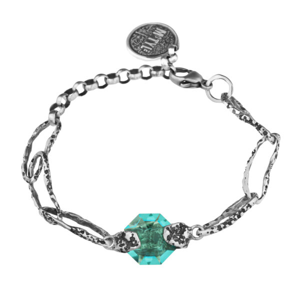 Ręcznie wykonane ogniwa z oksydowanego srebra 925 i złoconego mosiądzu mają nieregularną strukturę, która wygląda jak powierzchnia uformowana przez naturę. Centralnym elementem bransoletki jest turkusowy kryształ Swarovskiego, przyciągający uwagę czystością i intensywnym połyskiem.