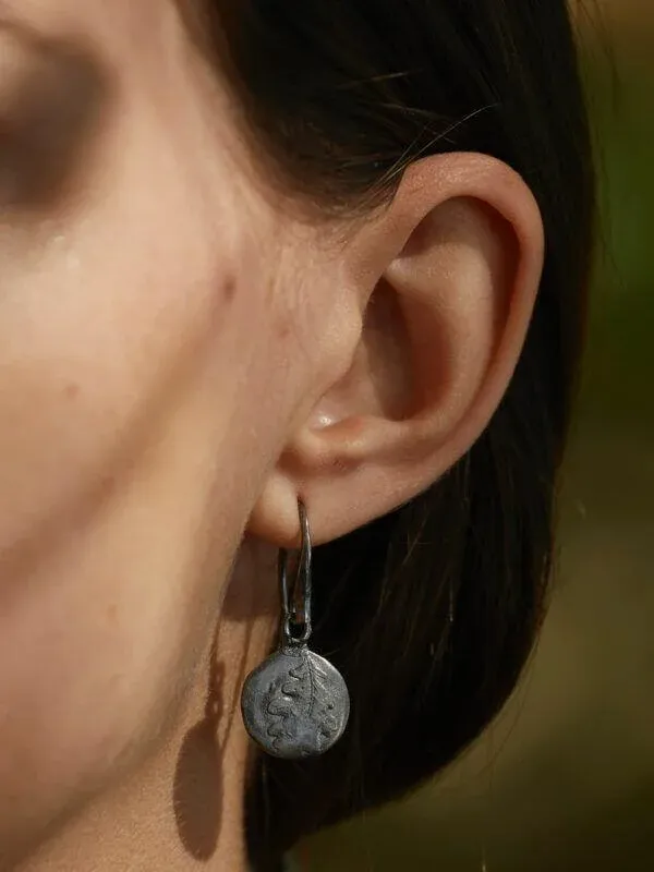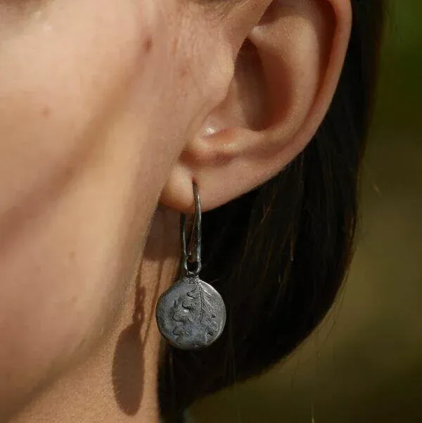 Artystyczne kolczyki zostały zaprojektowane i wykonane w naszej autorskiej pracowni biżuterii Motyle w Sopocie. Niezwykły design srebrnych kolczyków stworzony dzięki połączeniu klasycznej formy z unikatowym rzeźbionym medalionem. Płaskorzeźba znajdująca się na srebrnych blaszkach to dębowy liść symbol siły i mądrości natury.
