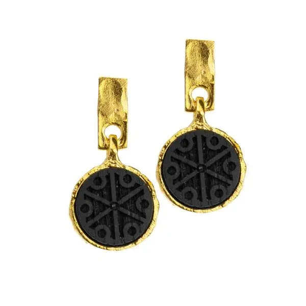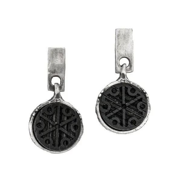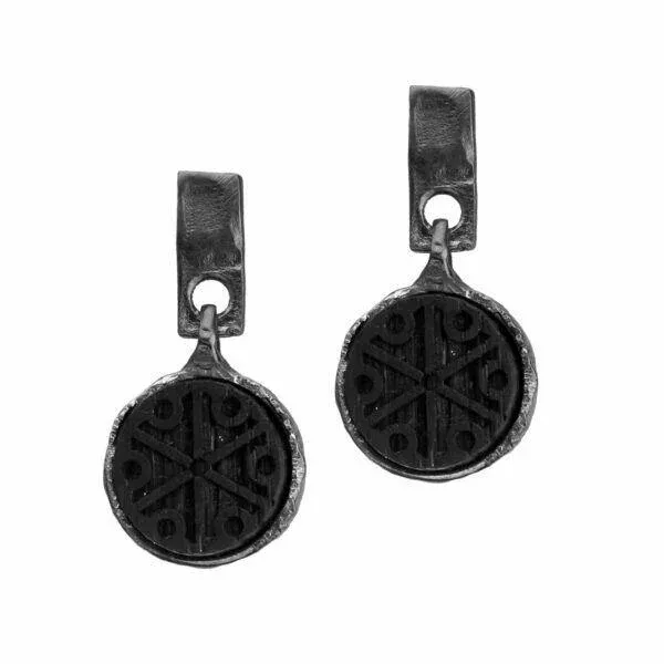 Artystyczne, wiszące kolczyki zostały zaprojektowane i wykonane w naszej autorskiej pracowni biżuterii Motyle w Sopocie. Niezwykły design kolczyków tworzy połączenie klasycznego, okrągłego kształtu czarnego dębu zamkniętego w srebrną oprawę. Grawerunek wykonany na dębowym drewnie to symbol ochronny. Wiszące kolczyki na srebrnych blaszkach to bardzo wygodna i elegancka forma będąca unikatowym dodatkiem do wielu kreacji.