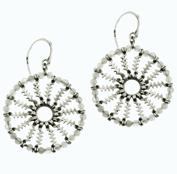 Artystyczne kolczyki zostały zaprojektowane i wykonane w atelier Motyle w Sopocie z największą dbałością o każdy szczegół. Srebrne kolczyki to połączenie unikalnego etnicznego stylu wraz z pięknie połyskującymi, drobnymi labradorytami.