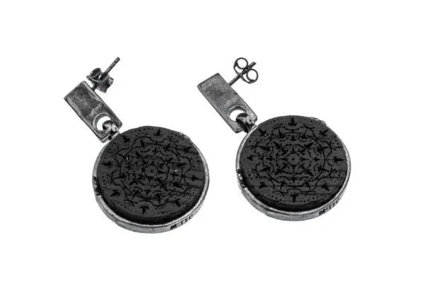 Artystyczne, wiszące kolczyki zostały zaprojektowane i wykonane w naszej autorskiej pracowni biżuterii Motyle w Sopocie. Niezwykły design kolczyków tworzy połączenie klasycznego, okrągłego kształtu czarnego dębu zamkniętego w srebrną oprawę. Grawerunek wykonany na dębowym drewnie to symbol ochronny. Wiszące kolczyki na srebrnych blaszkach to bardzo wygodna i elegancka forma będąca unikatowym dodatkiem do wielu kreacji.