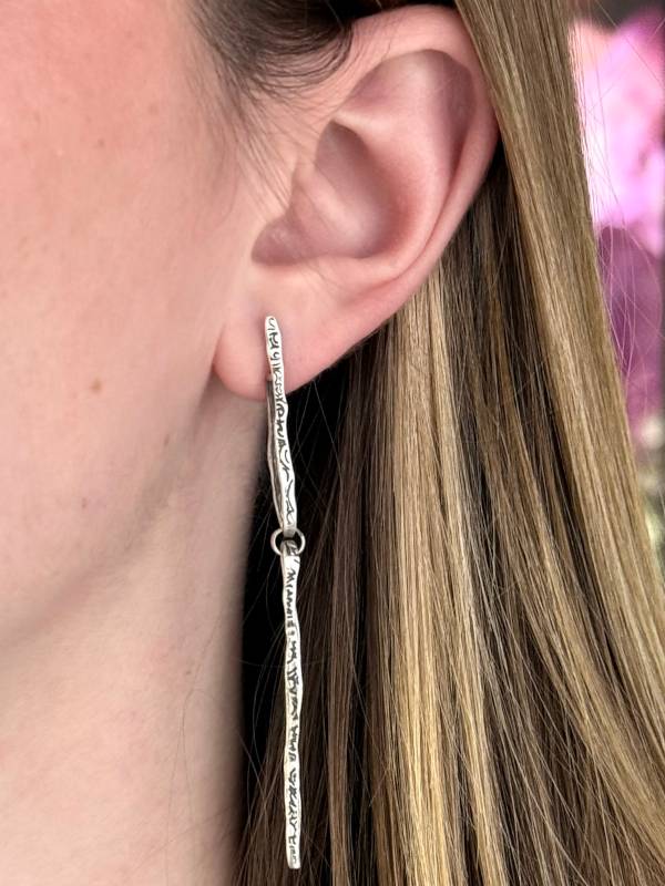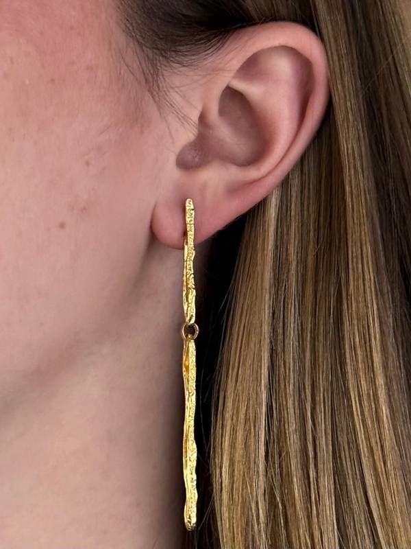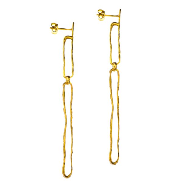 Długie, smukłe kolczyki o długości 7,5 cm składają się z dwóch ogniw o różnych rozmiarach, połączonych w subtelną całość. Ich geometryczna konstrukcja nadaje stylizacji lekkości i współczesnej elegancji. Idealne dla kobiet ceniących prostotę i unikalne detale.