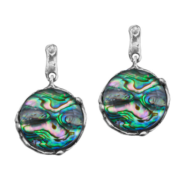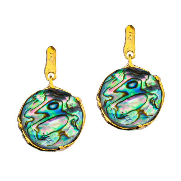 Te kolczyki artystyczne handmade to subtelna forma, w której główną rolę odgrywa naturalne piękno kamienia. Okrągłe elementy z muszli abalone zachwycają opalizującą powierzchnią i niepowtarzalnym wzorem – każdy egzemplarz jest inny. Ręcznie wykonana oprawa podkreśla organiczny charakter biżuterii. Kolczyki na sztyft są wygodne, a ich forma sprawia, że pięknie odbijają światło i delikatnie poruszają się przy każdym ruchu.