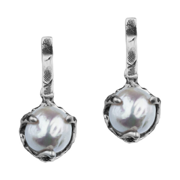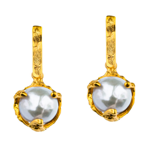 Te kolczyki z perłami słodkowodnymi to bardziej subtelna i codzienna odsłona kolekcji. Ich forma jest kompaktowa, ale pełna detalu – naturalna perła została otulona ręcznie wykonanym srebrem i mosiądzem, które wyglądają jak organiczne osłony uformowana przez wodę.