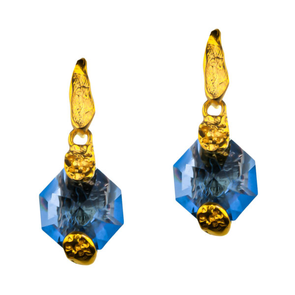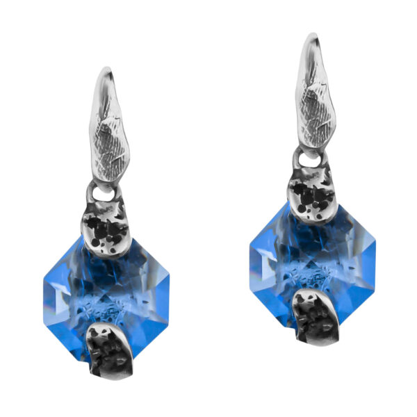 Srebro i mosiądz tworzą surową, organiczną oprawę, w której osadzono niebieskie kryształy Swarovskiego. Ich kolor przypomina taflę wód oceanu i pięknie zmienia się w zależności od światła.