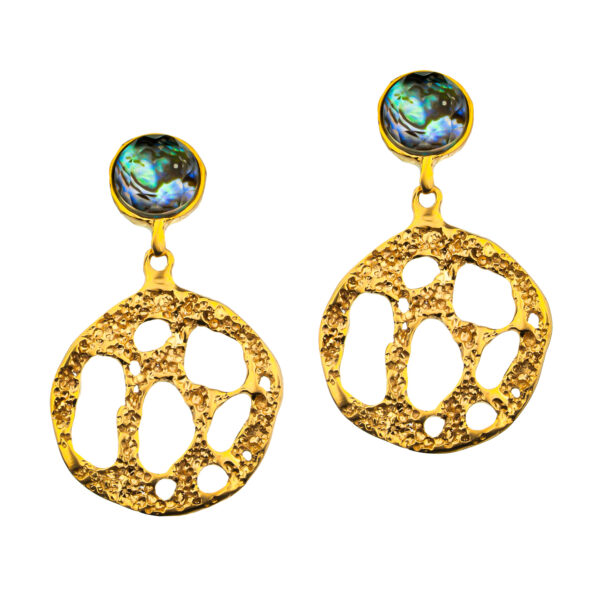 Te kolczyki artystyczne ręcznie robione to połączenie lekkiej formy i wyrazistej struktury inspirowanej naturą. Ażurowe, organiczne kształty z złoconego mosiądzu i oksydowanego srebra nawiązują do morskiej piany i fal, a osadzona u góry muszla abalone z kryształem górskim dodają im subtelnego, wielowymiarowego blasku. Kolczyki pięknie odbijają światło i poruszają się razem z Tobą, tworząc efekt naturalnej lekkości.