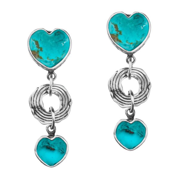 Kolczyki wykonane ze srebra o naturalnej, organicznej fakturze stanowią połączenie siły natury i delikatności kobiecej energii. Turkusy przyciągają spojrzenia swoją intensywną barwą, a finezyjne detale podkreślają artystyczny charakter całej formy.