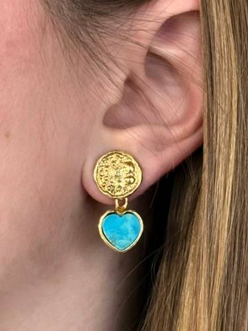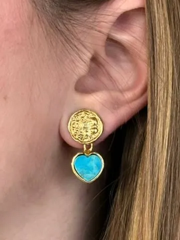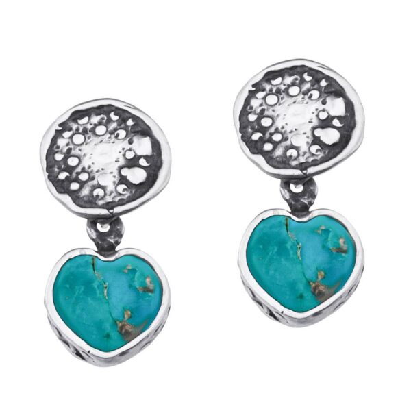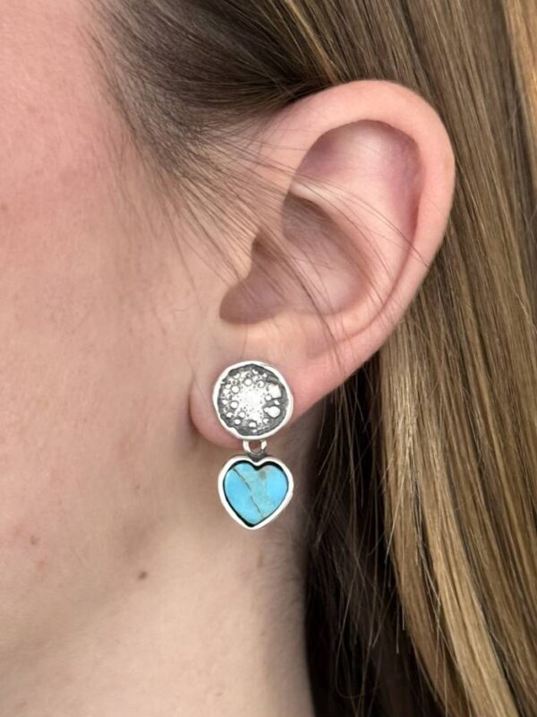 Delikatne kolczyki to opowieść o prostocie, która skrywa głębię. W ich formie spotykają się dwa światy: surowość srebra i miękkość turkusu, zimny blask metalu i ciepło duchowej energii. W centrum kompozycji pulsuje turkus – kamień nieba, szczęścia i spokoju. Jego barwa otula spojrzenie jak bezkresne himalajskie niebo, w którym giną myśli, a pozostaje tylko cisza. Serce zawieszone na srebrze staje się symbolem podróży do wnętrza – tej, która prowadzi nie przez odległe krainy, lecz przez najcichsze zakamarki własnej duszy.