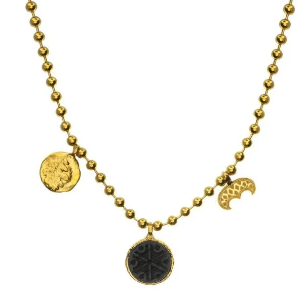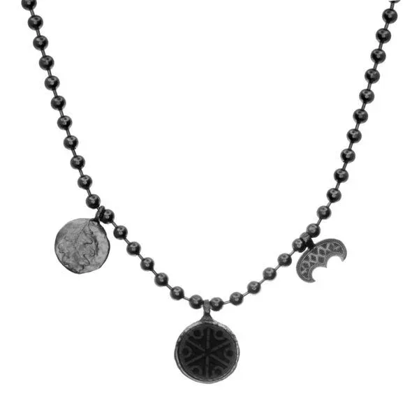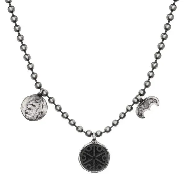 Artystyczny naszyjnik został zaprojektowany i wykonany w naszej autorskiej pracowni biżuterii Motyle w Sopocie. Niezwykły design srebrnego naszyjnika tworzy połączenie klasycznego kulkowego łańcuszka ozdobionego etnicznymi dodatkami w formie przywieszonych medalionów tj.:
