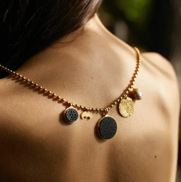 Artystyczny naszyjnik został zaprojektowany i wykonany w naszej autorskiej pracowni biżuterii Motyle w Sopocie. Niezwykły design srebrnego naszyjnika tworzy połączenie klasycznego kulkowego łańcuszka ozdobionego etnicznymi dodatkami w formie przywieszonych medalionów tj.: