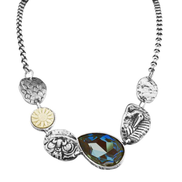 Głównym elementem ozdobnym naszyjnika jest lśniący kryształ Swarovskiego o wymiarach 3 × 2 cm, który przyciąga światło, dodając kompozycji niezwykłej głębi i blasku. Jego subtelna gra barw nawiązuje do czystości i transcendencji białego łabędzia – symbolu mądrości i duchowego oczyszczenia. Dodatkowym, wyjątkowym akcentem jest ręcznie rzeźbiony element z poroża jelenia o średnicy 1,5 cm. Każdy taki detal jest niepowtarzalny, co czyni każdy egzemplarz biżuterii jedynym w swoim rodzaju.