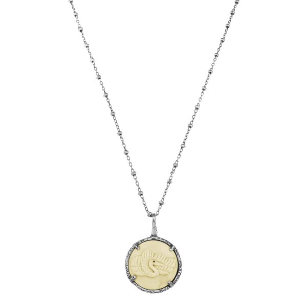 Centralnym punktem naszyjnika jest misternie rzeźbiony element ozdobny z poroża jelenia o średnicy około 2,3 cm. Ten naturalny materiał, posiadający certyfikat etycznego pochodzenia, dodaje biżuterii niepowtarzalnego charakteru, jednocześnie podkreślając harmonię człowieka z naturą.