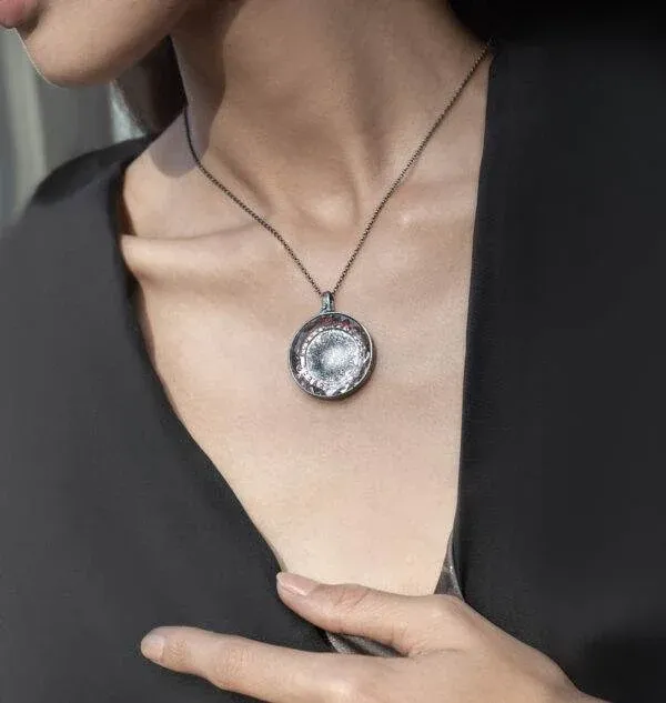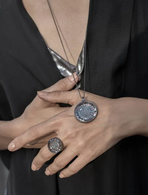 Unikatowy naszyjnik srebrny wykonany w naszej autorskiej pracowni biżuterii z najwyższą dbałością o detale. Szlachetna, okrągła forma naszyjnika została ozdobiona maleńkimi czerwonymi kamieniami, oraz jednym dużym kryształem przepięknie rozpraszającym promienie światła. Ciekawa faktura srebrnej oprawy kamienia przypomina meteor. Powłoka srebra została pokryta czarnym rodem, dzięki temu zabiegowi naszyjnik uzyskał tajemniczy i pozaziemski charakter. Wyjątkowy design i unikatowy charakter naszyjnika to doskonały wybór dla miłośniczek indywidualnych form biżuterii.