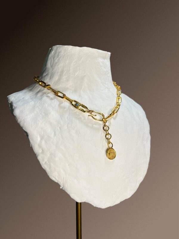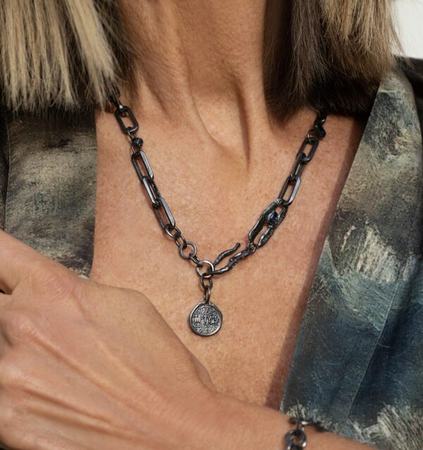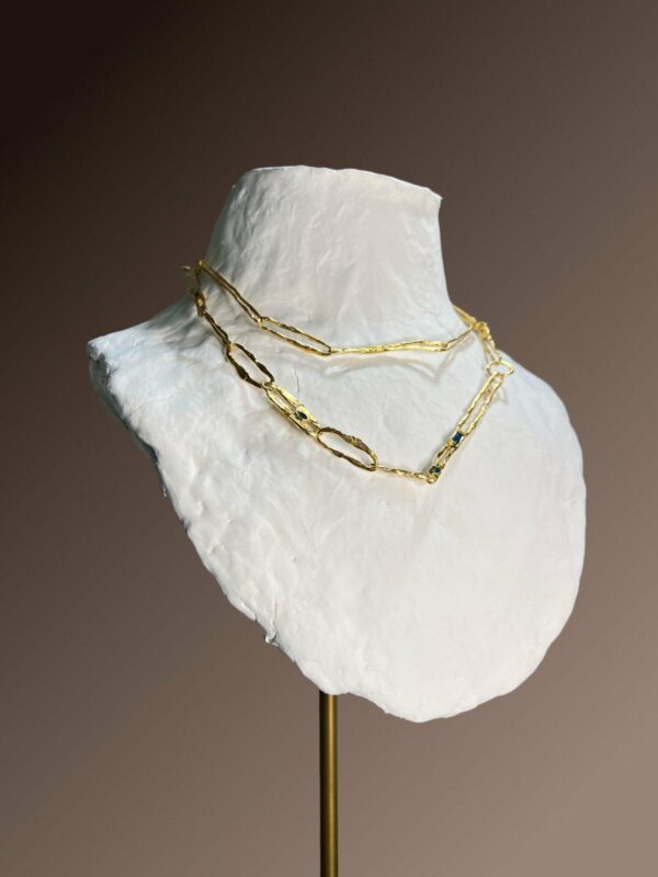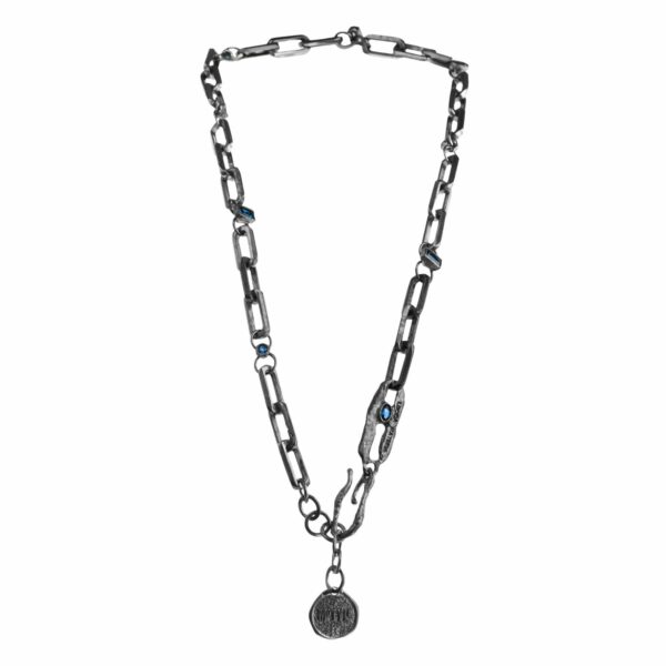 Zanurz się w głębię sztuki i natury z naszyjnikiem z kolekcji Magma. Ten artystyczny naszyjnik, stworzony ręcznie w autorskiej pracowni biżuterii Motyle, to nie tylko biżuteria – to opowieść o transformacji i nowym życiu. Regularne ogniwa łączą się w harmonijną całość, a ozdobne elementy z nanokryształami w kolorze london blue topaz przyciągają wzrok i nadają wyjątkowego blasku.