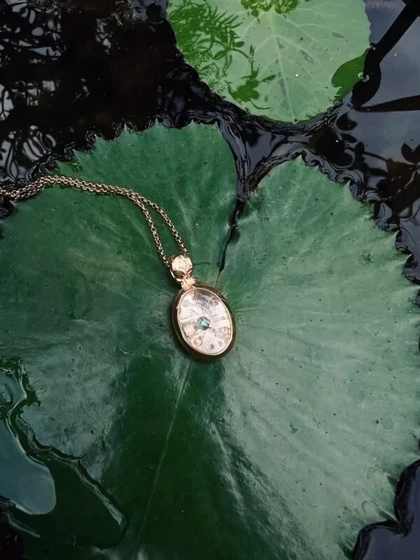 Artystyczny naszyjnik został zaprojektowany i wykonany w naszej autorskiej pracowni biżuterii. Klasyczny, owalny kształt naszyjnika został przełamany nowym podejściem do osadzania kamieni. Idealnie czysty kryształ górski kryje pod sobą wygrawerowane słowa mantry: