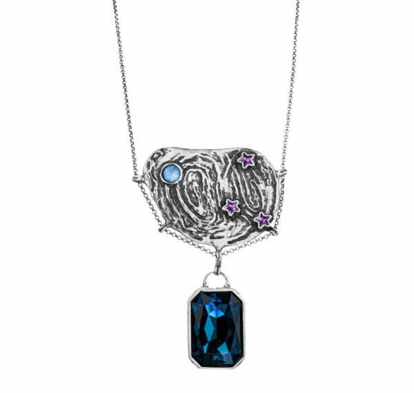 Inspirowany twórczością Van Gogha, naszyjnik wyróżnia się niepowtarzalną fakturą srebra oraz fascynującą grą kolorów i kształtów kryształów. Z jednej strony dominuje ciemnoniebieski kryształ oraz delikatne gwiazdki, z drugiej – biały kryształ z żółtym akcentem. Ten intrygujący układ nawiązuje wprost do słynnego obrazu “Gwiaździsta noc”.