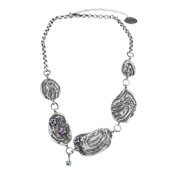 Wyjątkowa struktura srebra, w której odwzorowano technikę malarską Van Gogha, nadaje naszyjnikowi niepowtarzalny charakter. Piękne, ciemnoniebieski kryształ przyciąga wzrok, a delikatne gwiazdki subtelnie podkreślają elegancję całości. Możesz nosić go na dwa sposoby – bardziej ozdobnie lub w minimalistycznym stylu, dopasowując do każdej stylizacji.