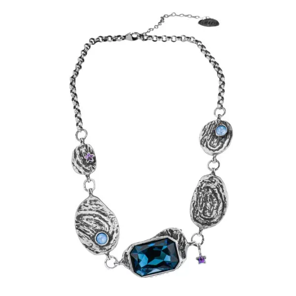 Centralnym elementem naszyjnika jest duży kryształ Swarovskiego w kolorze Montana/Linen o wymiarach 3 cm x 2 cm. Jego głęboki, tajemniczy odcień przywodzi na myśl rozgwieżdżone niebo, w którym światło i mrok splatają się w harmonijną całość. Dodatkowe akcenty w postaci kryształu Swarovskiego w kształcie kółka w kolorze Sky Ignite (0,7 cm) oraz gwiazdki w odcieniu Vitrail Light (0,5 cm) sprawiają, że naszyjnik zachwyca subtelną grą refleksów świetlnych, przywodząc na myśl pulsującą energię gwiazd.