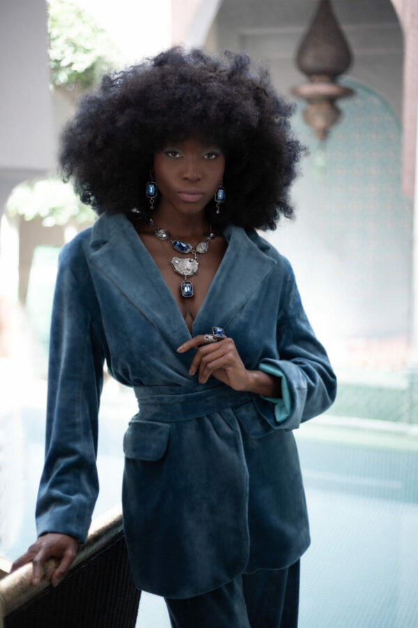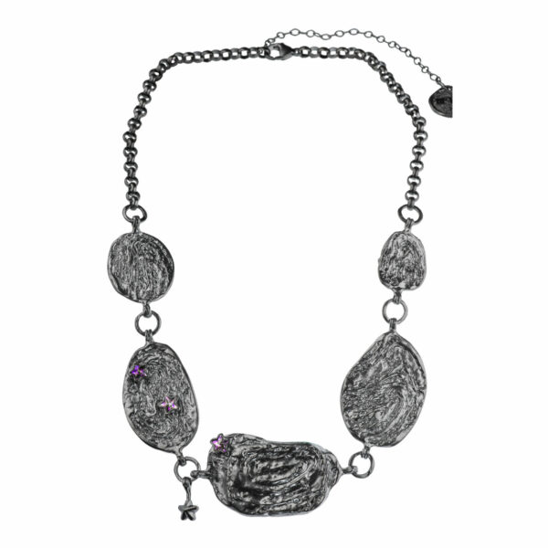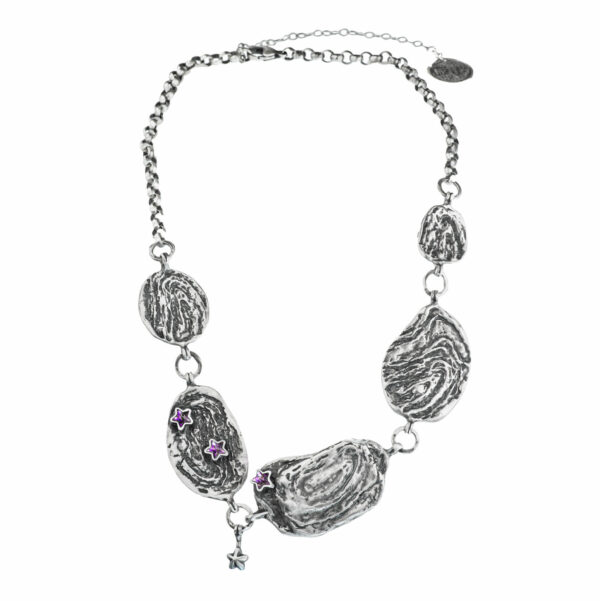 Centralnym elementem naszyjnika jest duży kryształ Swarovskiego w kolorze Montana/Linen o wymiarach 3 cm x 2 cm. Jego głęboki, tajemniczy odcień przywodzi na myśl rozgwieżdżone niebo, w którym światło i mrok splatają się w harmonijną całość. Dodatkowe akcenty w postaci kryształu Swarovskiego w kształcie kółka w kolorze Sky Ignite (0,7 cm) oraz gwiazdki w odcieniu Vitrail Light (0,5 cm) sprawiają, że naszyjnik zachwyca subtelną grą refleksów świetlnych, przywodząc na myśl pulsującą energię gwiazd.
