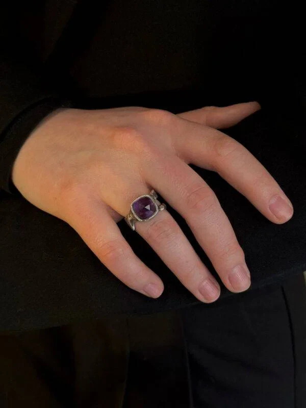 Artystyczny pierścionek został wykonany ręcznie. Ciekawa forma obrączki podkreśla naturalny kamień, jego delikatność i ulotność. Ametyst to kamień pełen magii i tajemniczego wdzięku. Design oprawy srebrnej jest idealnym połączeniem z naturalnym kamieniem, tworząc unikatową formę pierścionka.