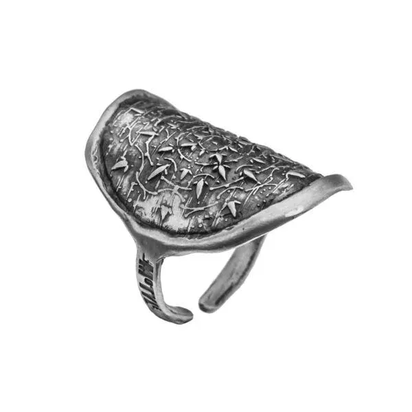 Artystyczny srebrny pierścionek w formie medalionu to ręcznie wykonana kopia prastarej mandali- symbolu harmonii, dobrobytu i szczęścia. Idealnie układający się na palcu pierścionek został zaprojektowany i wykonany w sopockiej pracowni biżuterii Motyle. Wykuta w srebrze mandala to wyjątkowe amulety tworzący etniczny design w codziennych stylizacjach. Forma obrączki jest otwarta dzięki czemu pozwala na delikatne dopasowanie rozmiaru pierścionka.
