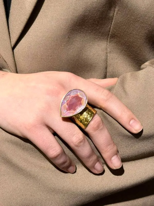 Pierścionek z tej kolekcji to biżuteria pełna symboliki – łączy w sobie elementy natury, harmonii i miłości do piękna. Centralny kryształ Swarovskiego, o głębokim różowym odcieniu, opalizujący na niebiesko, przypomina magiczne refleksy świetlne. Jest on symbolem intuicji i delikatności, a jego kolor nawiązuje do miłości, ciepła i emocjonalnej równowagi.