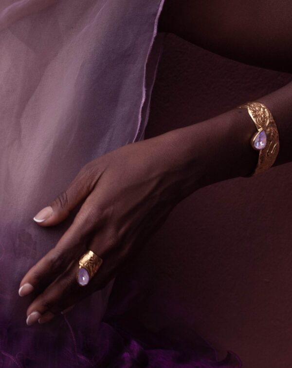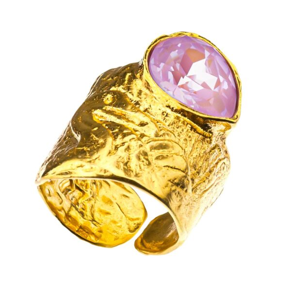 Pierścionek z tej kolekcji to biżuteria pełna symboliki – łączy w sobie elementy natury, harmonii i miłości do piękna. Kryształ Swarovskiego, o głębokim różowym odcieniu, opalizujący na niebiesko, przypomina magiczne refleksy świetlne. Jest on symbolem intuicji i delikatności, a jego kolor nawiązuje do miłości, ciepła i emocjonalnej równowagi.