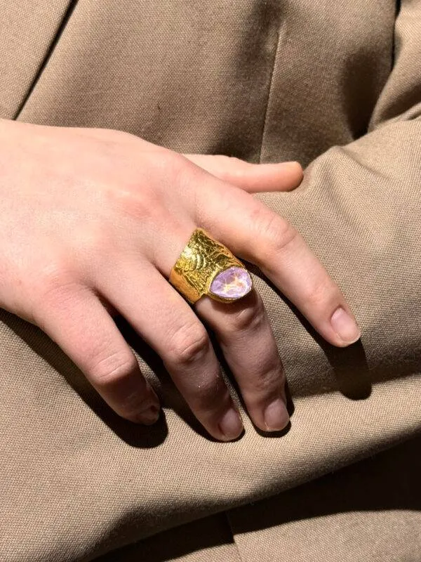 Pierścionek z tej kolekcji to biżuteria pełna symboliki – łączy w sobie elementy natury, harmonii i miłości do piękna. Kryształ Swarovskiego, o głębokim różowym odcieniu, opalizujący na niebiesko, przypomina magiczne refleksy świetlne. Jest on symbolem intuicji i delikatności, a jego kolor nawiązuje do miłości, ciepła i emocjonalnej równowagi.