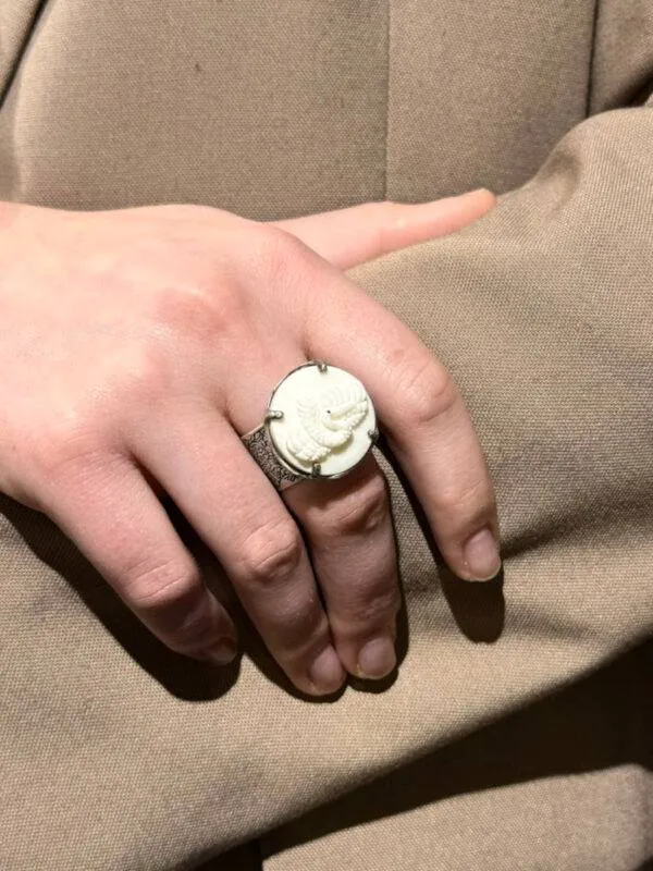 W centrum pierścionka znajduje się ręcznie rzeźbiony element ozdobny z poroża jelenia o średnicy około 2,3 cm. Jego naturalna struktura i unikalny kształt nadają pierścionkowi niepowtarzalny charakter, przyciągając wzrok i stanowiąc konkretny akcent wśród biżuterii.
