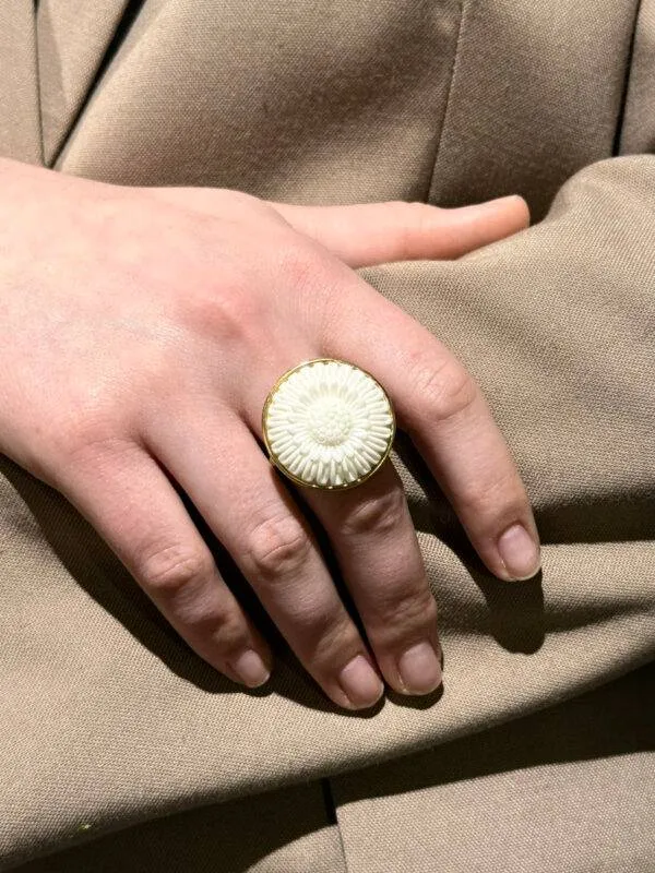 W centrum pierścionka znajduje się ręcznie rzeźbiony element ozdobny z poroża jelenia o średnicy około 2,5 cm. Jego naturalna struktura i unikalny kształt nadają pierścionkowi niepowtarzalny charakter, przyciągając wzrok i stanowiąc konkretny akcent wśród biżuterii.