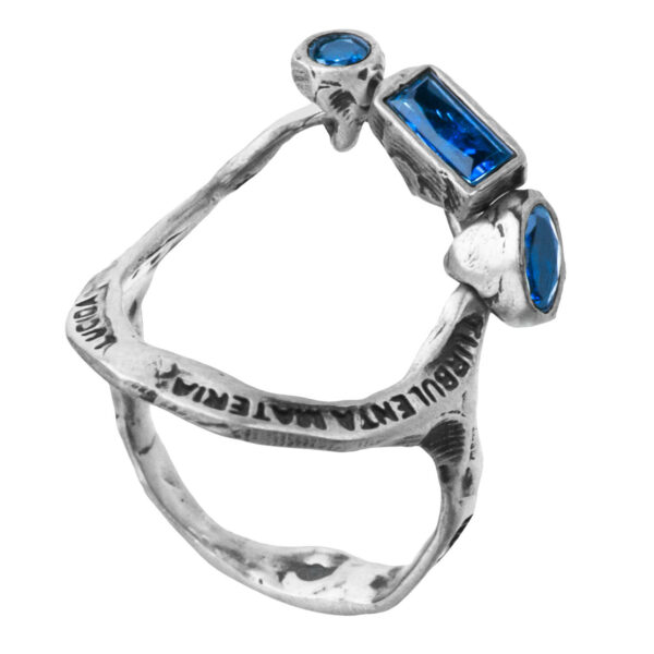Na szynie pierścionka wygrawerowane są dwie sentencje w języku łacińskim: „Lucida materia” – świetlista materia oraz „Turbulenta materia” – turbulentna materia. Te słowa przypominają nam o sile i dynamice życia, które przejawiają się w każdej chwili.