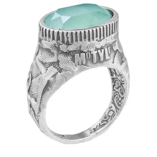 Srebrny pierścionek został wykonany ręcznie w autorskiej pracowni biżuterii Motyle z największą dbałością o każdy szczegół. Unikatowy model stanowi połączenie srebra o wyjątkowej fakturze wraz z kryształem o szlifie, który zjawiskowo odbija światło. Kryształ w pięknym kolorze umieszczony jest centralnie na szerokiej szynie. Otwarta forma pierścionka powoduje, że łatwo dopasowuje się do palca. Unikatowy pierścionek idealnie sprawdzi się w monochromatycznych stylizacjach.