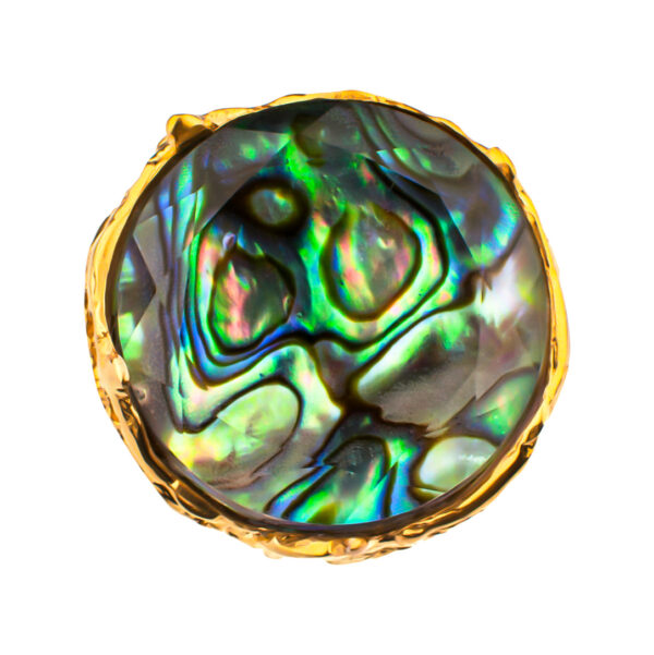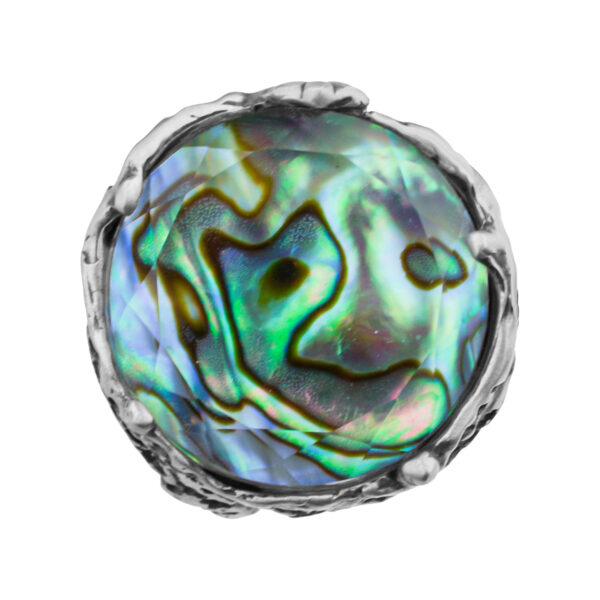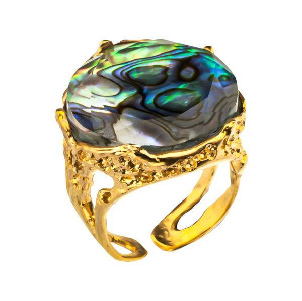 Ten pierścionek z kamieniem naturalnym to forma skoncentrowana wokół struktury i koloru. Duża muszla abalone o nieregularnym wzorze stanowi centralny punkt projektu, przyciągając uwagę swoją głębią i zmiennością barw. Oprawa jest nieregularna, co podkreśla ręczny charakter wykonania. To pierścionek, który działa jak akcent – prosty w formie, ale wyrazisty w odbiorze.