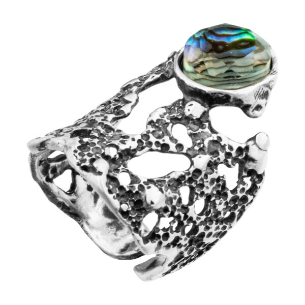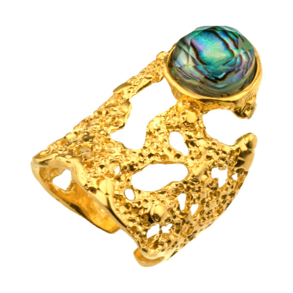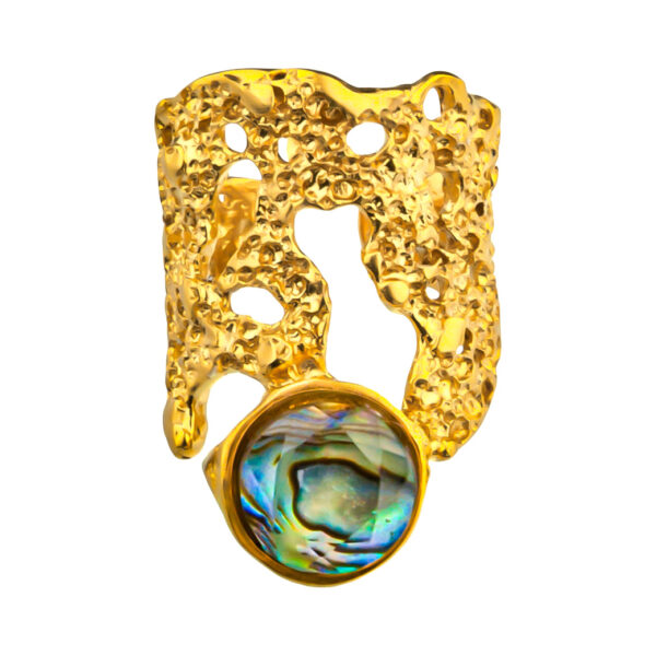 Ten pierścionek artystyczny handmade wyróżnia się rzeźbiarską, nieregularną formą inspirowaną naturą i ruchem wody. Wykonany z złoconego mosiądzu lub oksydowanego srebra, posiada wyrazistą strukturę, która wygląda jak uformowana przez żywioł. Centralnym punktem jest muszla abalone z kryształem górskim, nadająca całości głębi i subtelnego blasku.