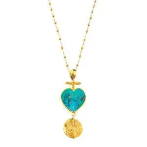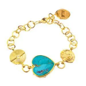 W tej minimalistycznej kompozycji kryje się opowieść o równowadze i czystości. Szeroka szyna symbolizuje stabilność i siłę – fundament, na którym można oprzeć wewnętrzny spokój. Serce z turkusu, kamienia szczęścia i harmonii, wprowadza łagodność i przypomina o potrzebie zatrzymania. To nie biżuteria, która krzyczy – to biżuteria, która oddycha.