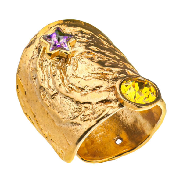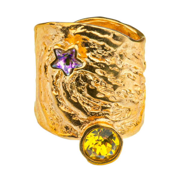 W naszej ręcznie robionej biżuterii odwzorowaliśmy charakterystyczne pociągnięcia pędzlem które nadają ruch i dynamikę. Na fakturze srebra widoczne są szybkie , kręte ruchy które tworzą wirujące formy i sugestywnie odzwierciedlają ruch gwiazd na nocnym niebie. W kolekcji użyliśmy również najwyżej jakości kryształów, żywych odcieni żółci, niebieskiego i białego. Razem tworzące wrażenie pulsującej energii.