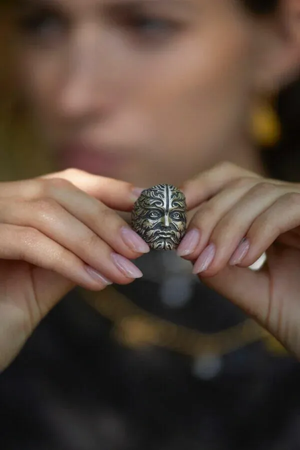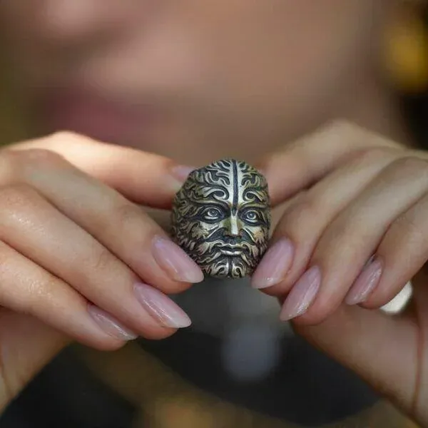 Artystyczny, oryginalny pierścionek z wyobrażeniem istoty ducha lasu, wykonany ręcznie w autorskiej pracowni biżuterii Motyle z największą dbałością o każdy detal. Dedykowany jest dla mężczyzn a wykonany z najwyższej jakości próby srebra. Autorski pierścień wspaniale sprawdzi się w połączeniu z codziennymi stylizacjami.